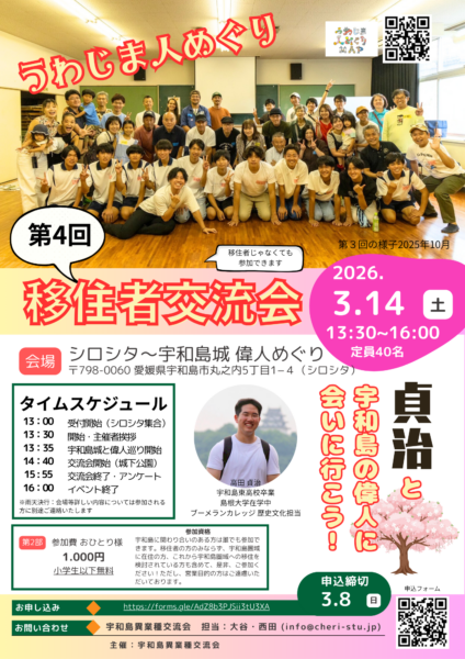 お待たせしました! タイトルにもありますように、第4回うわじま人めぐり移住者交流j会の開始日が決定しました!